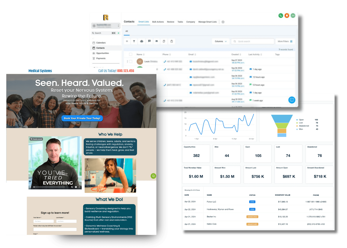 Our high-converting landing pages are designed to turn interest into action with clean design, compelling messaging, and seamless forms. Behind the scenes, our CRM tracks every lead, automates follow-ups, and gives you a full view of your sales pipeline, all in one easy-to-use system. It’s the digital backbone of your marketing engine, built to capture more patients with less effort.